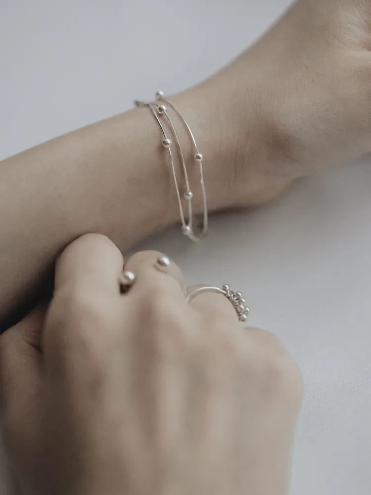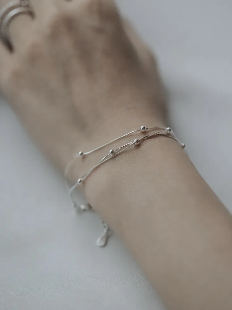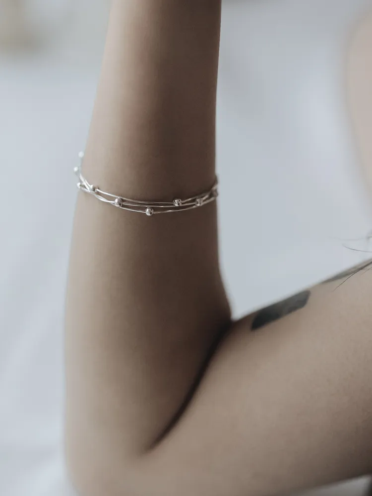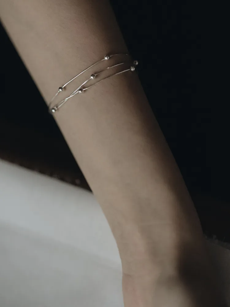 纖細的銀絲線條,如流動的月光輕輕環繞腕間,點綴小巧銀珠,宛若夜空中的微光星辰,低調而閃耀~