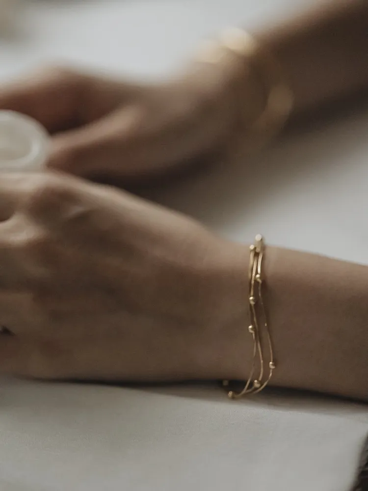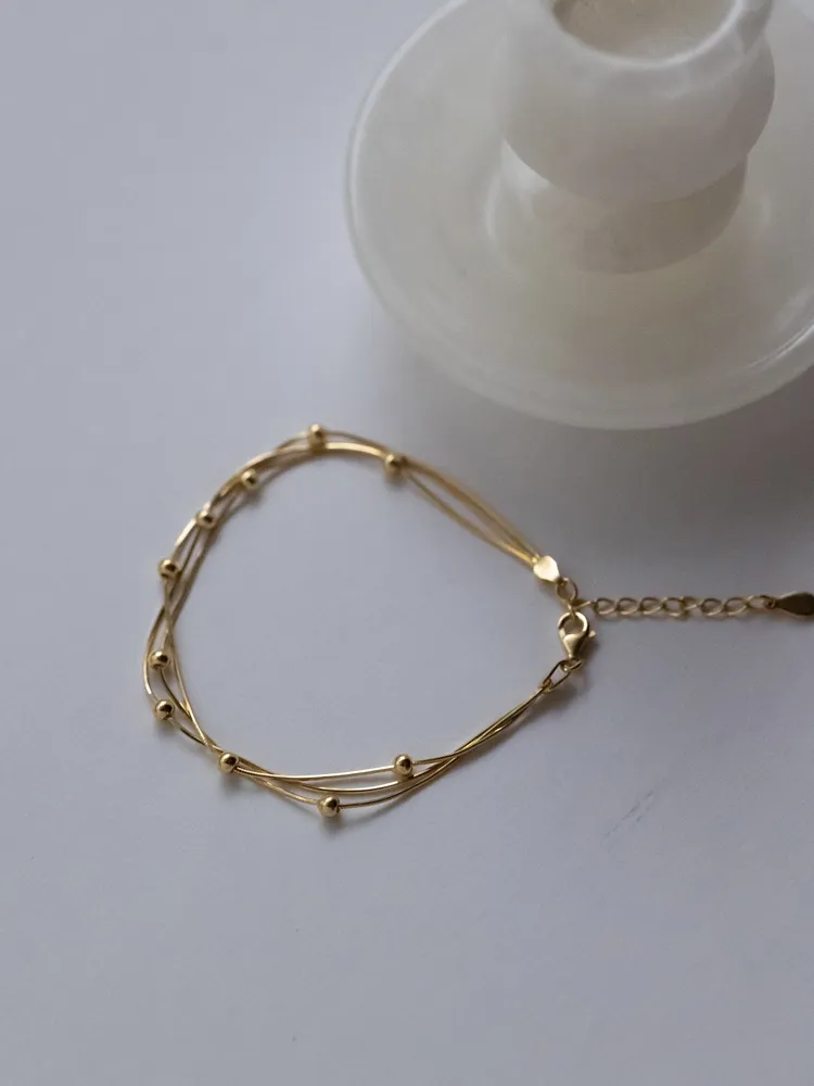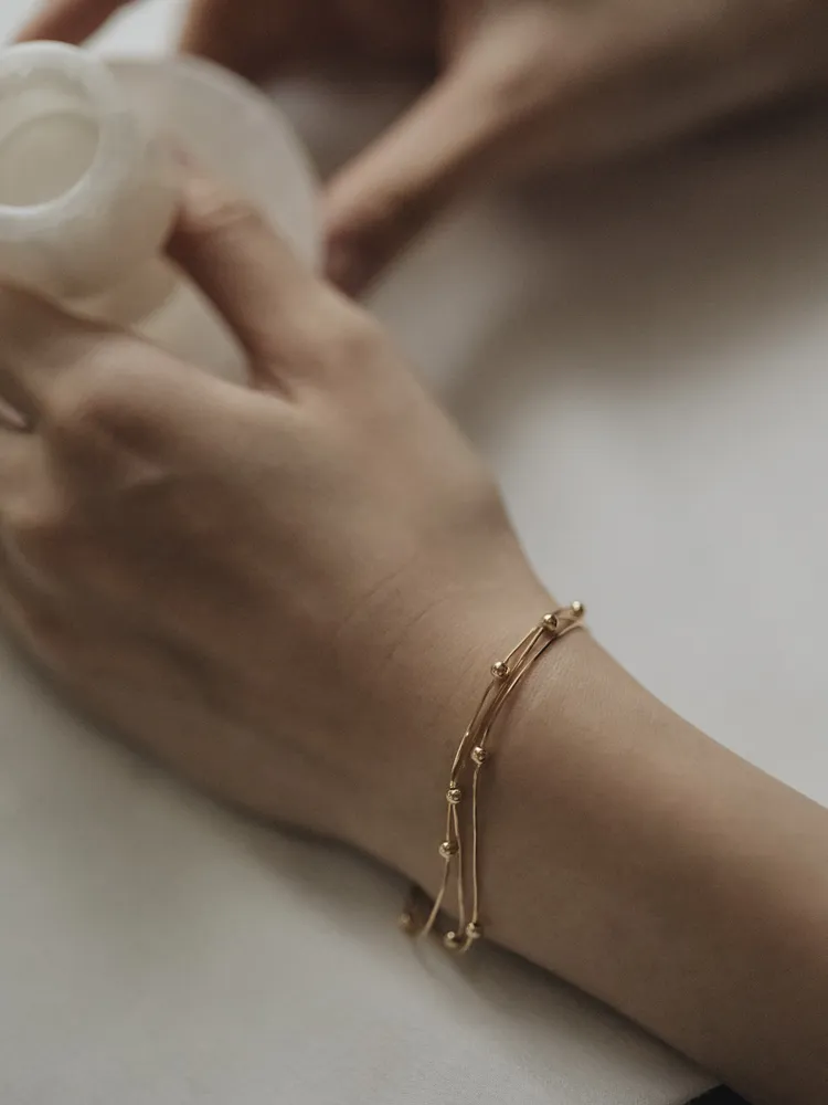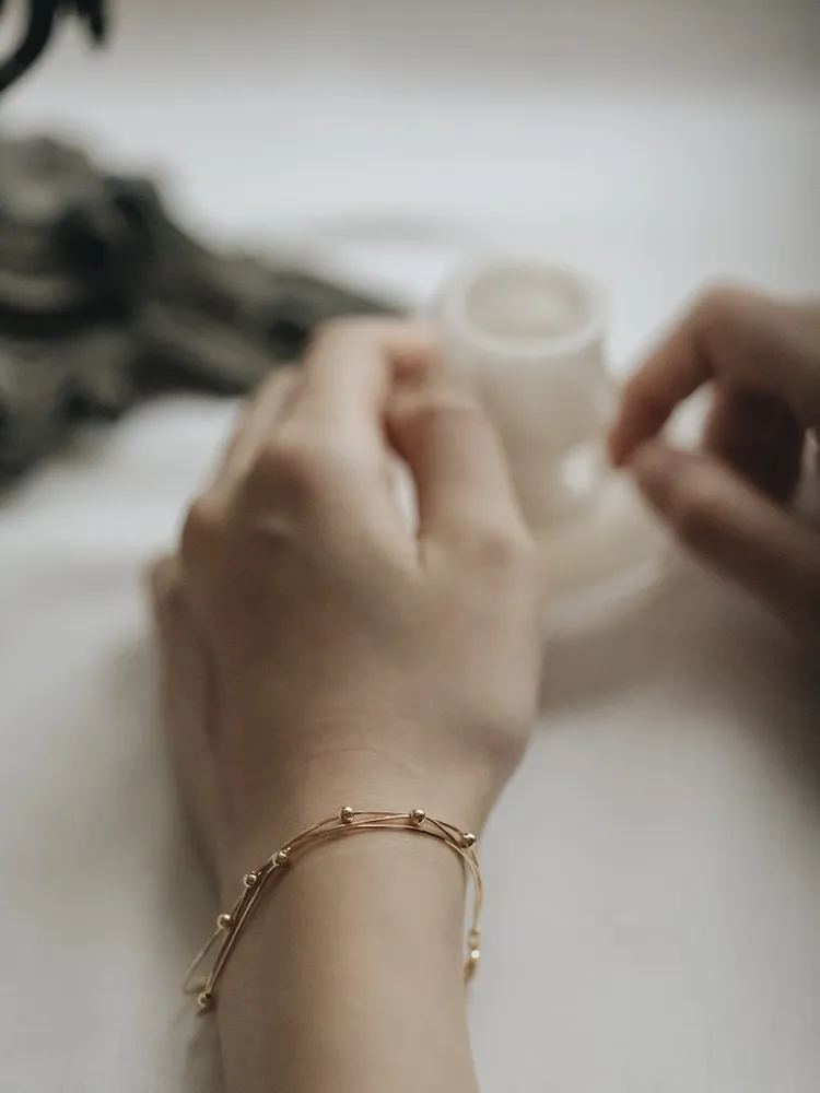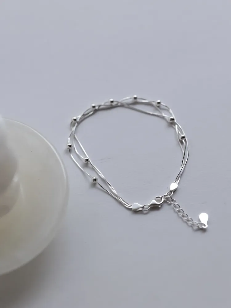 纖細的銀絲線條,如流動的月光輕輕環繞腕間,點綴小巧銀珠,宛若夜空中的微光星辰,低調而閃耀~